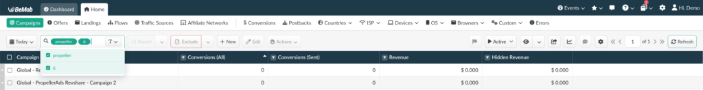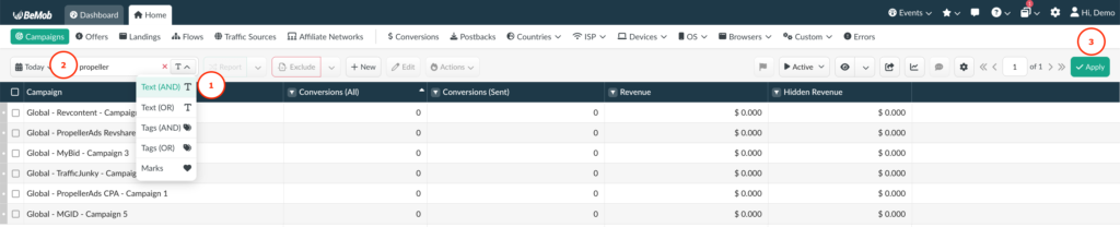 These search types are available in reports for: campaigns, offers, flows, landing pages, traffic sources, and affiliate networks.