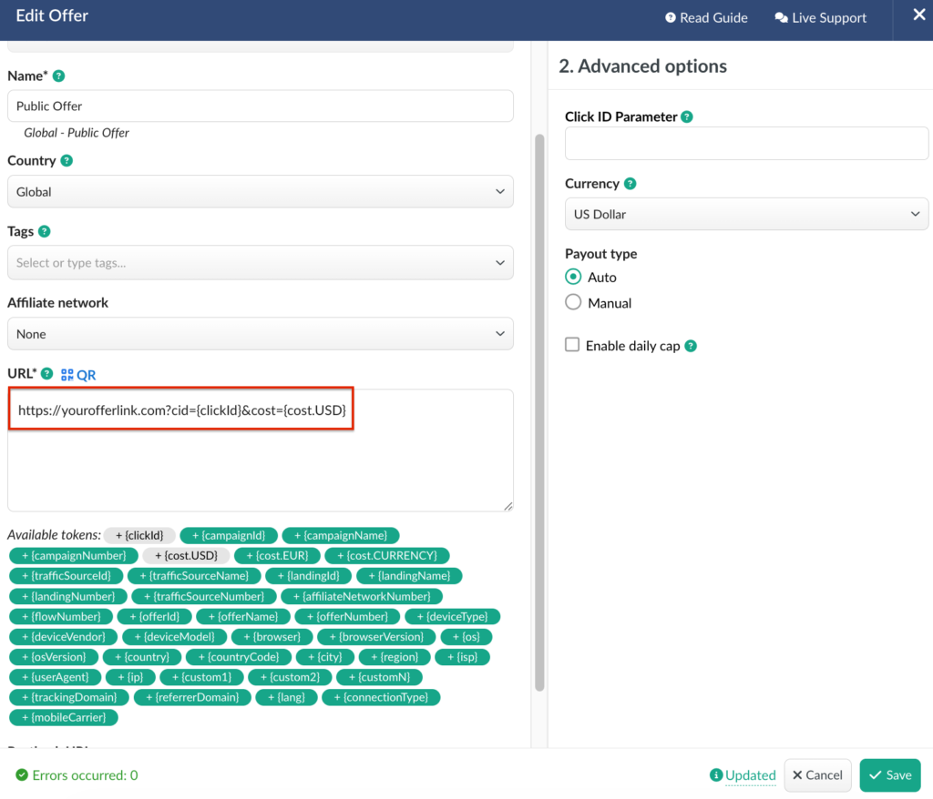 • Append the {cost.CURRENCY} macro to the end of the offer URL together with the cost passing parameter.