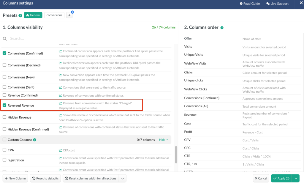 A high rate of reversed conversions and growing reversed revenue may indicate issues with conversion quality or potential dishonesty from an affiliate network or direct advertiser. This data can help you detect and investigate possible discrepancies.