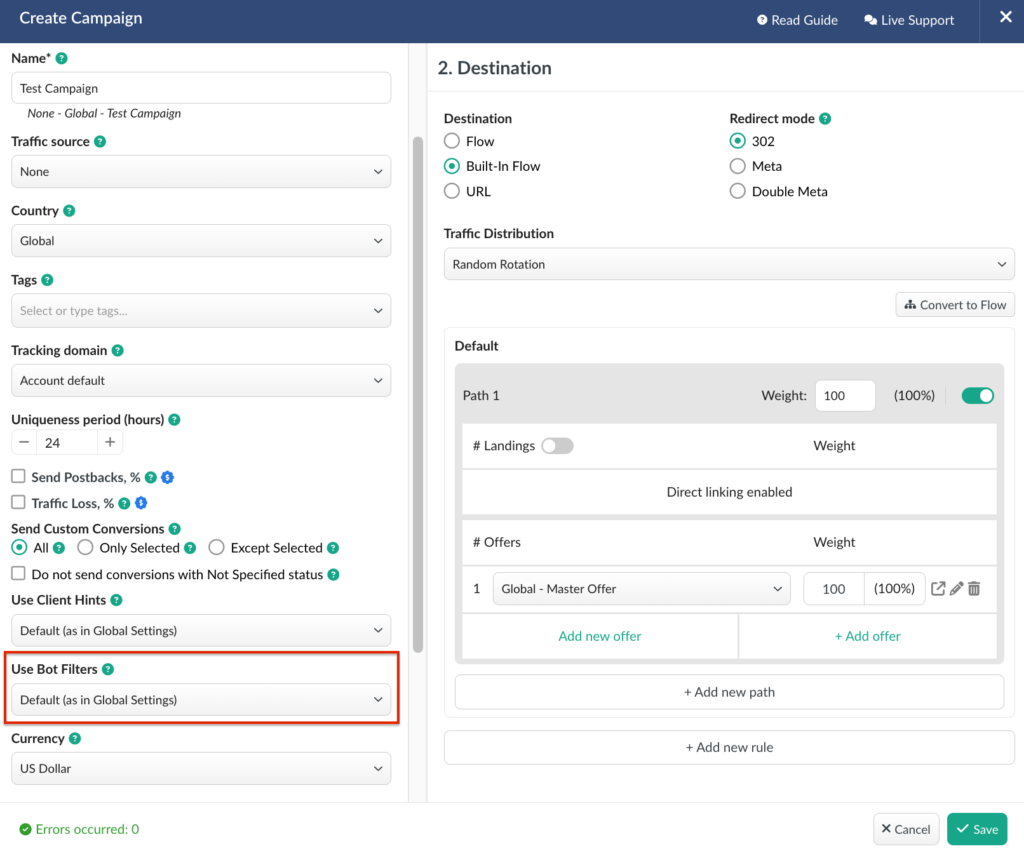 You can now enable or disable bot filters individually for each campaign, overriding the global account settings when needed.